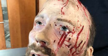 The severed head was created by the NT Props Department for the 2018 production of Macbeth staged on the Olivier theatre which starred Rory Kinnear in the title role. The Props Department collaborated with London based company FBFX and used state-of-the-art scanning technology, which has never been used by the team before, to take a 3D scan of Kinnear’s head. This created a digital skin which was then printed into a 3D object. A silicone mould was taken from the 3D printed object and a polyurethane cast was made. The head was then brought to life with fibre glass eyes inserted into the sockets, individual fibre glass teeth planted into the mouth, skin tones painted to resemble Kinnear’s flesh, latex veins sculpted and painted to dangle from the neck and individual strands of hair punctured into the skin to form hair and a beard by the Wigs, Hair & Make-Up Department.